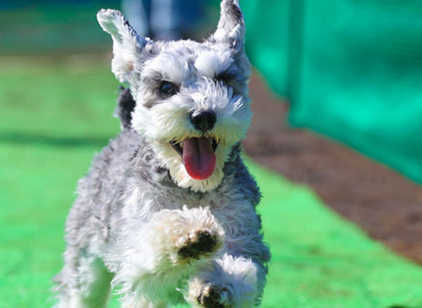 ワンちゃんも飼い主も、ごきげんに飛び跳ねる。